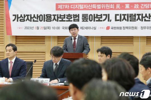 윤창현 국민의힘 디지털자산특별위원회 위원장이 25일 오전 서울 여의도 국회의원회관에서 열린 '제7차 디지털자산특별위원회 민·당·정 간담회'에서 인사말을 하고 있다. 2023.5.25/뉴스1 |