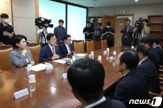 (과천=뉴스1) 신웅수 기자 = 이만희 의원을 비롯한 국회 행정안전위원회 소속 국민의힘 의원들이 23일 오전 경기 과천시 중앙선거관리위원회를 항의 방문해 박찬진 사무총장과 대화하고 있다. 국민의힘은 선관위가 북한 해킹 공격과 관련해 국가정보원의 보안 점검 컨설팅을 거부한 것과 선관위 고위직 자녀들의 특혜 채용 의혹에 대해 비판했다. 2023.5.23/뉴스1 Copyright (C) 뉴스1. All rights reserved. 무단 전재 및 재배포 금지. |