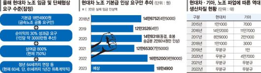 기본급 인상폭 18만4900원은 역대 최대 인상폭이었던 지난해 인상액 10만8000원(기본급 9만8000원+수당 1만원)보다도 71.2%나 많은 것이다. 통상, 노조의 기본급 요구안이 12만~14만원 정도였다는 점을 감안해도 대폭 증가한 것이다. 노조는 월 급여 성격의 상여금도 현재 750%에서 800%로 증액을 요구한다는 방침이다. 임금 및 단체 협상의 단골손님으로 올라온 '순이익의 30%를 성과급으로 배분해달라'는 요구도 올해 한층 거세질 것으로 보인다. 지난해 현대차 순이익(7조9836억원)의 30%를 약 7만명인 전체 직원 수로 나누면 1인당 성과급 지급 규모가 3400만원이라는 계산이 나온다.