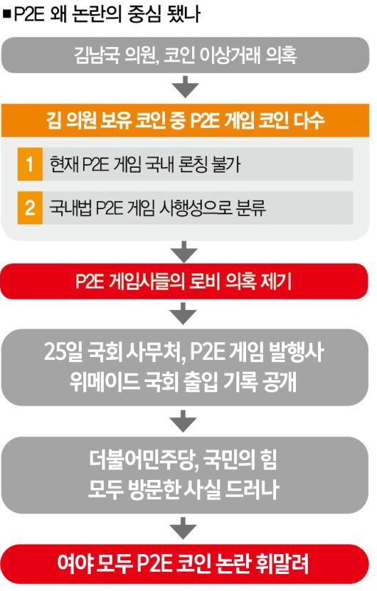 # 최근엔 P2E를 발행하는 게임사 관계자가 여야의원을 만나기 위해 국회를 찾았다는 게 알려지면서 사태가 일파만파로 확산하고 있습니다. P2E가 대체 뭐길래 논란의 중심에 서게 된 걸까요. 그 답을 차근차근 살펴봤습니다.