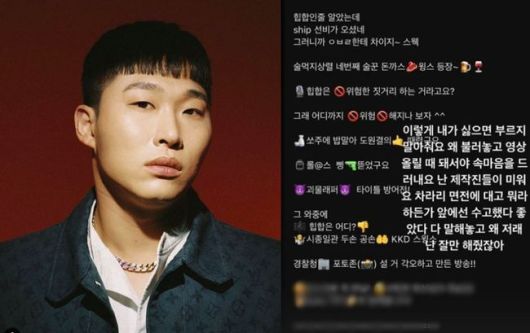진짜 문제는 지금부터다. 영상 공개에 맞춰 '술먹지상렬' 제작진은 "힙합인줄 알았는데 ship 선비가 오셨네 그러니까 ㅇㅂㄹ한테 차이지~ 스웩"이라며 "술먹지상렬 네번째 술꾼 돈까스윙스 등장~ 힙합은 위험한 짓거리 하는 거라고요? 그래 어디까지 위험해지나 보자^^ 쏘주에 밥말아 도원결의 때렸구요 롤@스 삥 뜯었구요 경찰청 포토존 설 거 각오하고 만든 방송!!"이라는 조롱 가득한 멘트를 공개했다.