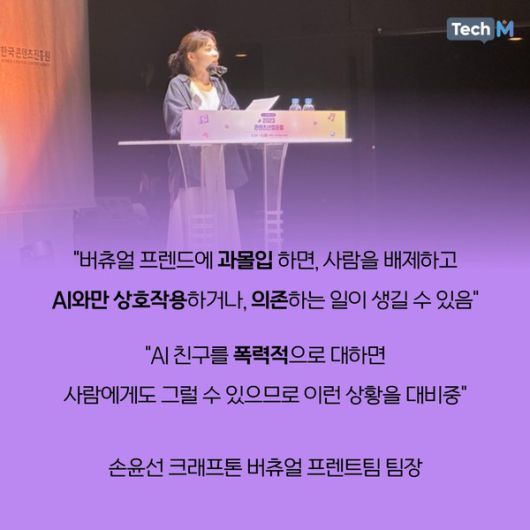 손윤선 크래프톤 버츄얼 프렌트팀 팀장은 25일 서울 광화문 CKL 스테이지에서 열린 콘텐츠산업 포럼에서 '비욘드 게임'을 주제로 발표했다. 이날 손윤선 팀장은 AI 기술로 게임에서 새로운 재미를 끌어내고, 게임 제작과정을 혁신할 수 있다고 말했다. 크래프톤은 AI 기술을 활용해 버츄얼 프렌드를 만들고 있다. 인게임 내에서 이용자와 소통할 수 있는 캐릭터를 만드는 것이다.