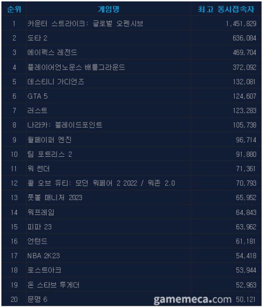 일 최고 동시접속자 TOP 20에서는 1위인 카운터 스트라이크: 글로벌 오펜시브 동시접속자가 전일 대비 20만 명가량 감소했다. 워프레임은 6만 4,843명으로 2단계 상승해 14위에 올랐으며, 문명 6가 5만 121명으로 20위를 기록했다.