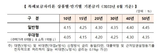 이에 우대형은 연 4.05%(10년)∼4.35%(50년), 일반형은 연 4.15%(10년)∼ 4.45%(50년)의 금리가 적용된다.