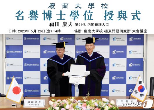 경남대는 이날 오후 서울 종로구 소재 경남대 극동문제연구소에서 후쿠다 전 총리에 대한 학위 수여식을 개최했다.