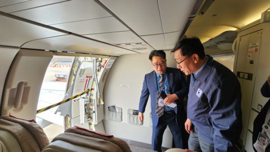 어명소 국토교통부 2차관이 26일 비상구 도어 열림 사고가 발생한 아시아나항공 8124편을 점검하고 있다. |