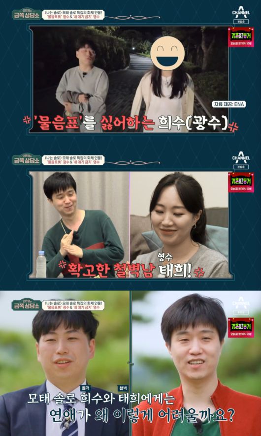 [OSEN=박소영 기자] ‘나는 솔로’ 12기 모태 솔로 특집에 출연했던 광수와 영수가 채널A ‘오은영의 금쪽상담소’를 찾았다. 그런데 이 방송에서 옥순은 얼굴을 모자이크를 한 반면 영숙은 얼굴 그대로 공개해 눈길을 끌었다.