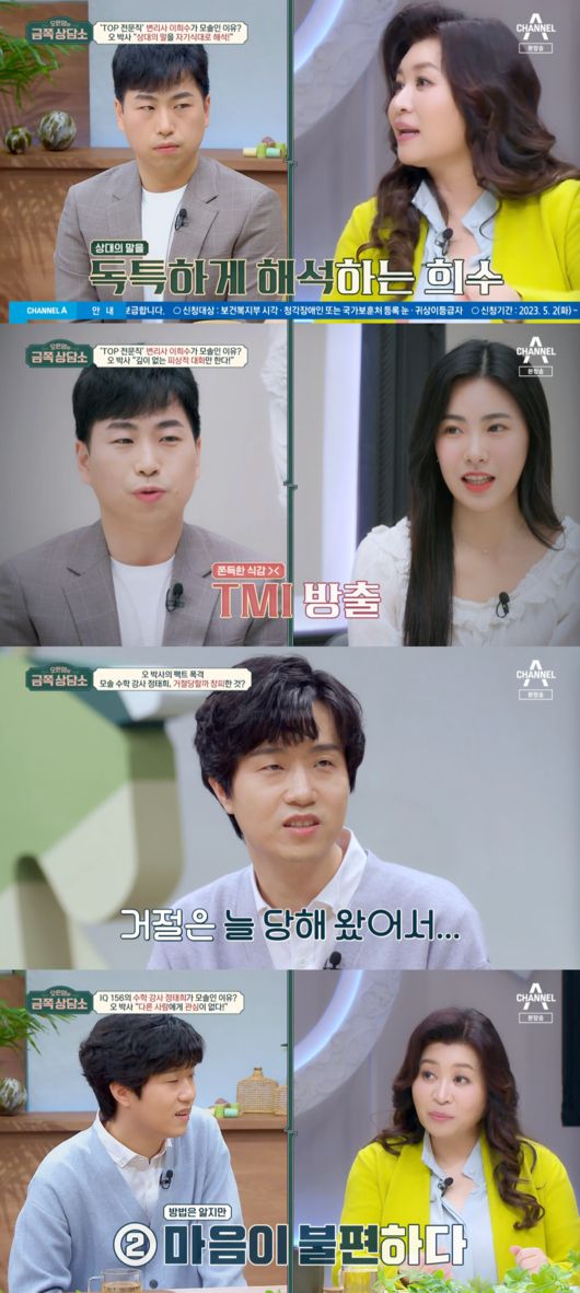 26일 오후 전파를 탄 ‘오은영의 금쪽상담소’에서 광수는 “여러분의 물음표를 느낌표로 바꾸기 위해 나온 33세 변리사 이희수”라고 자신을 소개했다. 함께 나온 영수는 “오늘은 내 얘기 금지 아닌 내 얘기 오케이. 39살 수학 강사 정태희”라고 말했다.