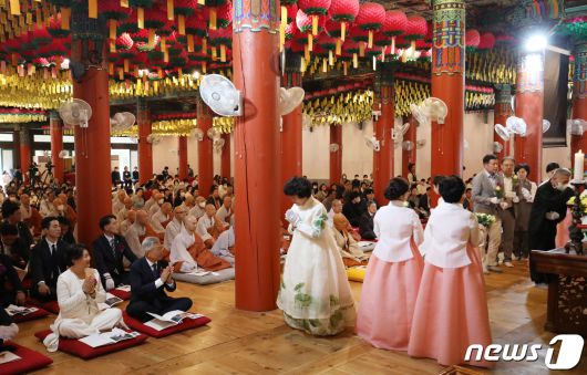 (양산=뉴스1) 윤일지 기자 = 문재인 전 대통령과 김정숙 여사가 27일 경남 양산 통도사에서 열린 불기 2567년 부처님오신날 봉축법요식에 참석해 있다. 2023.5.27/뉴스1yoonphoto@news1.krCopyright ⓒ 뉴스1. All rights reserved. 무단 전재 및 재배포 금지.