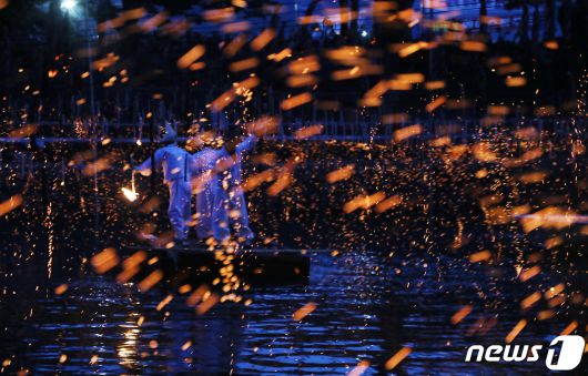 (함안=뉴스1) 윤일지 기자 = 27일 오후 경남 함안군 함안면 무진정에서 '함안 낙화놀이'가 펼쳐지고 있다. 경남 무형문화재 제33호인 함안 낙화놀이는 숯과 한지를 꼬아 만든 실 수천 개를 줄에 매달아 해질녘 불을 붙이는 민속놀이다. 2023.5.27/뉴스1yoonphoto@news1.krCopyright ⓒ 뉴스1. All rights reserved. 무단 전재 및 재배포 금지.