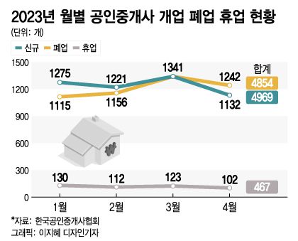 28일 한국공인중개사협회에 따르면 올해 1~4월 전국 공인중개사 사무소 휴업·폐업 수는 총 5321곳에 달한다. 새로 문을 연 사무소가 4969개인데, 문을 닫은 곳이 352개 더 많은 것이다.