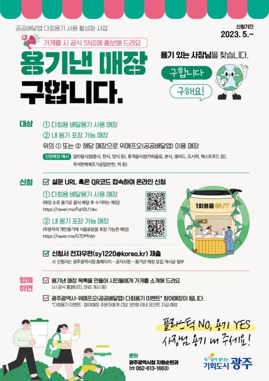 광주광역시가 1회용 배달용기를 줄이기 위해 광주공공배달앱인 '위메프오'와 협업해 오는 6월 말까지 '용기낸 매장'을 모집한다. 광주광역시 제공 |