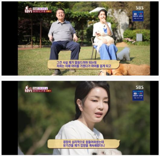 반려견을 많이 입양하게 된 것과 관련 아픈 사연을 소개하기도 했다. 김 여사는 "저희는 아이를 가졌다가 잃게 되고 (윤 대통령이) 심리적으로 힘들어하셨는데 유기견 입양을 해 왔더니 아빠(윤 대통령)가 너무 좋아했다. 집에 오면 아이들 밥해줄 생각에 기뻐서 고통을 잊으시더라"며 "사실은 다 임시 보호로 있었는데 하루 지내고 키워야겠다, 데려오고 싶어서 아빠 때문에 자꾸 늘어나게 된 것"이라고 말했다.
