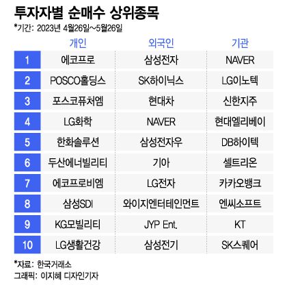 그에 반면 개인 투자자들은 이차전지주에 베팅했다. 개인 투자자들이 가장 많이 산 주식은 에코프로로 5340억원 어치 사들였다. POSCO홀딩스(5320억원), 포스코퓨처엠(4780억원), LG화학(2100억원), 에코프로비엠(1490억원), 삼성SDI(1350억원) 등도 쓸어담았다.