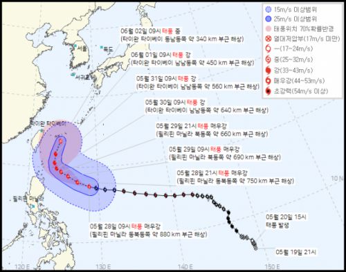 2호 태풍 '마와르'가 오는 31일 오전 9시께 타이완 타이베이 남남동쪽 약 560km 부근 해상에서 방향을 완전히 꺾어 일본 오키나와로 향할 것으로 예상된다.