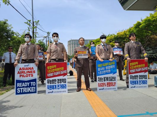 지난 17일 서울 여의도 산업은행 앞에서 아시아나항공 조종사노동조합이 임금 인상률 상향 조정을 요구하는 집회를 열고 있다. 아시아나항공 조종사노조 제공 |