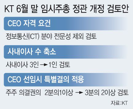 이후 새로운 사외이사들을 중심으로 바뀐 정관에 따라 대표이사(CEO)를 뽑는다. 이에 따라, 6월 임시주총이 차기 KT 리더십을 결정하는 분수령이 될 전망이다. 현재 이슈가 되는 것은 ① CEO 후보 자격요건 개정 ②사내이사 수 축소 ③CEO 선임 주총 특별결의 등이다.
