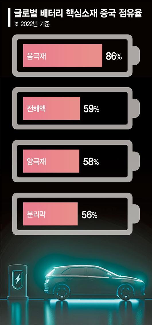 29일 관련 업계에 따르면 지난해 기준 중국의 이차전지 소재 글로벌 시장 점유율은 양극재 58%, 음극재 86%, 전해액 59%, 분리막 56%로 4대 핵심 소재 모두 과점체제를 구축하고 있다.