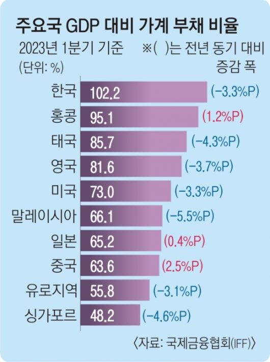 29일 국제금융협회(IIF)의 ‘세계 부채 모니터’ 보고서에 따르면 지난 1분기 기준 세계 34개국(유로 지역은 단일 통계)의 GDP 대비 가계 부채 비율이 가장 높은 곳은 우리나라(102.2%)였다. 이어 홍콩(95.1%)이 2위였으며 태국(85.7%), 영국(81.6%), 미국(73.0%), 말레이시아(66.1%) 등의 순이었다.