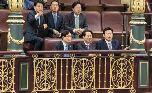 스페인 국회 구경 간 기재위 의원들 - 국회 기획재정위원회 관계자들이 지난 4월 20일 스페인 마드리드 의사당에서 하원 본회의를 참관하고 있다. 앞줄 맨 오른쪽부터 시계 방향으로 기재위 소속 국민의힘 윤영석·류성걸 의원, 더불어민주당 신동근 의원, 박상훈 스페인 대사, 민주당 김주영 의원, 국민의힘 송언석 의원. /국회 기획재정위원회 |