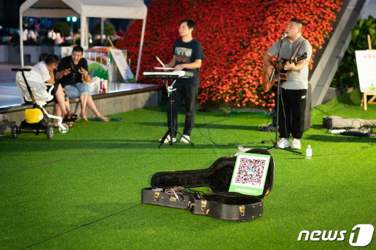 중국 선전 화창베이 거리 버스킹 공연 모습. 이들은 QR 코드를 큼직하게 내걸고 현금 대신 QR 결제를 받았다. 2023.5.17/뉴스1 ⓒ News1 이기범 기자 |
