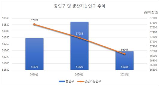 실제로 통계청이 발표한 '2021 인구주택총조사'에 따르면 우리나라 총인구는 5174만명으로 2020년보다 9만1000명이 감소한 것으로 나타났다. 출생아수는 사상 처음으로 25만명 밑으로 떨어 져, 가임여성 1명이 평생동안 낳을 것으로 예상되는 평균 출생아수는 0.78명으로 집계됐다. 경제협력개발기구(OECD) 평균(1.59명)보다 낮은 수준으로 38개 회원국 중 최하위인 셈이다.