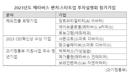 과학기술정보통신부는 투자 유치와 해외 진출을 희망하는 메타버스 분야 유망 벤처·스타트업과 국내 유수의 벤처투자사(VC)가 참여하는 2023년도 메타버스 벤처·스타트업 투자설명회를 이달 31일 서울 마포구 누리꿈스퀘어에서 개최한다고 30일 밝혔다.
