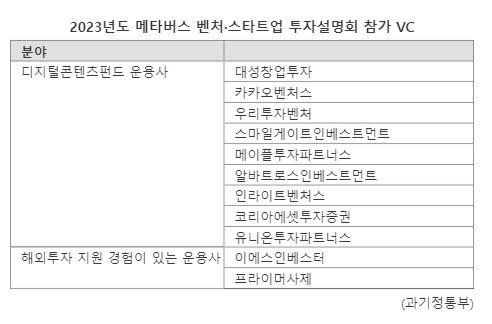 참가기업은 K-디지털 해외진출 희망 기업, 2023 국제전자제품박람회(CES) 혁신상 수상 기업, 청년 기업 등 성장 잠재력이 높은 메타버스 기업 8곳을 중심으로 구성됐다. VC는 디지털콘텐츠펀드 운용사와 해외투자 지원 경험을 보유한 운용사 등 11개사가 참여한다.