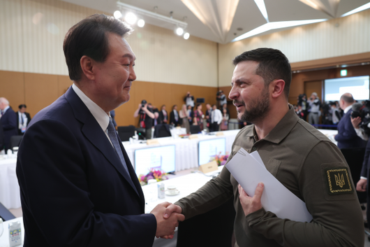 윤석열 대통령, 한-우크라이나 정상회담 - G7 정상회의 참관국 자격으로 일본을 방문 중인 윤석열 대통령과 G7 정상회의에 전격적으로 참석한 볼로디미르 젤렌스키 우크라이나 대통령이 21일 히로시마 G7 정상회의장인 그랜드프린스호텔에서 열린 한국-우크라이나 정상회담에서 기념촬영 하고 있다. 2023.5.21 공동취재 |