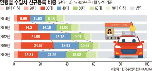 2006년 기준 수입차 시장에서 30대의 구매비율(9.57%)이 40대(9.47%)를 1.0% 포인트(p) 앞서기 시작했다. 30대 비율이 40대를 앞선 것은 이때가 처음이다. 이후 30대의 구매비율은 꾸준히 40대를 앞섰다. 평균 6.0%p 차이를 두고 수입차 시장 최대 고객으로 등극했다.
