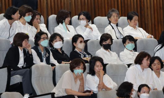 재표결 지켜보는 간호사들 30일 간호사들이 국회 본회의장 방청석에 간호법 재표결을 보기 위해 모여 있다. 윤석열 대통령이 재의요구권(거부권)을 행사한 간호법 제정안은 이날 국회 본회의 재표결에서 부결됐다. 서상배 선임기자 |
