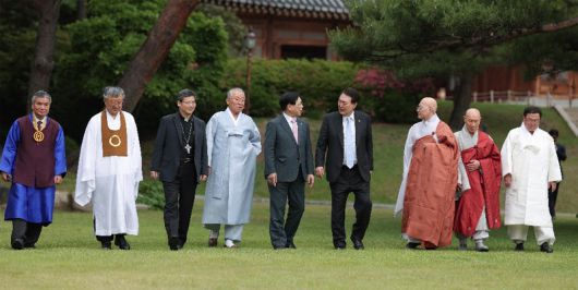 윤석열 대통령이 30일 청와대 상춘재에서 열린 종교지도자 초청 오찬 간담회를 마친 뒤 상춘재 앞 뜰을 지나 본관까지 참석자들에게 경내를 안내하고 있다. 이날 간담회에는 조계종 총무원장 진우 스님, 천태종 총무원장 덕수 스님, 한국교회총연합회 대표회장 이영훈 목사, 명성교회 김삼환 원로목사, 천주교 정순택 서울대교구장, 원불교 나상호 교정원장, 최종수 성균관장, 천도교 박상종 교령, 한국민족종교협의회 김령하 회장 등 종교계 지도자 9명이 참석했다. 왼쪽부터 박상종 교령, 나상호 교정원장, 정순택 서울대교구장, 최종수 성균관장, 이영훈 목사, 윤 대통령, 진우 스님, 덕수 스님, 김령하 회장.