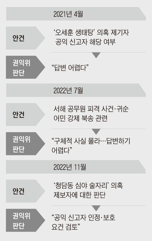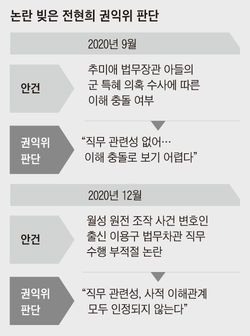실제 전 위원장이 취임한 이후 권익위는 추미애 법무장관 아들이 군 특혜 의혹으로 검찰 수사를 받는 데 대해서 “이해 충돌로 보기 어렵고, 직무 관련성이 없다”고 판단했다. 또 이용구 전 법무차관이 ‘월성 원전 1호기 경제성 조작 사건’ 변호를 맡다가 법무부 고위직으로 직행(直行)하거나, 박범계 의원이 공동 폭행 혐의로 기소된 피고인 신분으로 법무장관 업무 수행을 하는 것도 문제가 없다는 취지로 결론 내렸다.