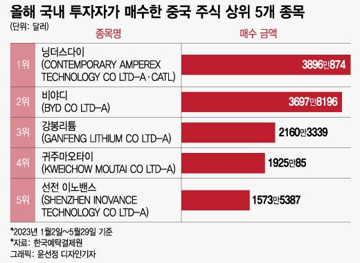 올해 국내 투자자가 가장 많이 매수한 종목 1위는 세계 최대 배터리 제조업체인 닝더스다이(CATL)로 3896만874달러(약 516억원)어치가 팔렸다. 2위는 중국 최대 전기차 업체 비야디(BYD)로 3697만 8196달러(약 489억원)어치, 3위는 중국 최대 리튬 생산업체 강봉리튬으로 2160만 3339달러(약 286억원) 매수됐다.