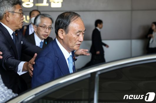 (서울=뉴스1) 이승배 기자 = 스가 요시히데 전 일본 총리가 31일 오전 서울 김포국제공항을 통해 입국해 차량에 탑승하고 있다. 일본 집권 자민당 소속 중의원(하원) 의원인 스가 전 총리는 일한의원연맹 회장 자격으로 방한해 윤석열 대통령을 예방하고, 일본 대사관 주최 행사 참석, 한일의원연맹 소속 의원들과 만찬회동을 할 예정이다. 2023.5.31/뉴스1
