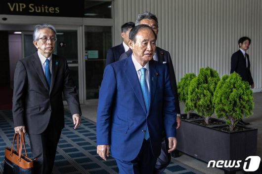 (서울=뉴스1) 이승배 기자 = 스가 요시히데 전 일본 총리가 31일 오전 서울 김포국제공항을 통해 입국해 차량으로 향하고 있다. 일본 집권 자민당 소속 중의원(하원) 의원인 스가 전 총리는 일한의원연맹 회장 자격으로 방한해 윤석열 대통령을 예방하고, 일본 대사관 주최 행사 참석, 한일의원연맹 소속 의원들과 만찬회동을 할 예정이다. 2023.5.31/뉴스1
