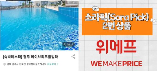 위메프에서는 경주의 메이브리즈 풀빌라를 평일 기준 쿠폰을 사용하면 4만9000원에 예약할 수 있습니다. 외부 수영장과 내부 수영장이 모두 있어 원없이 물놀이를 즐길 수 있습니다. 월차를 낼 이유가 충분한 숙소입니다.