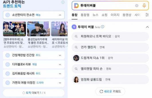 31일 오전7시12분 네이버 '트렌드 토픽'(왼쪽), 다음 '투데이 버블' 캡처한 모습. 토픽 더보기를 눌러도 북한 위성발사 관련 키워드는 등장하지 않았다. /사진=각 앱 캡처 |