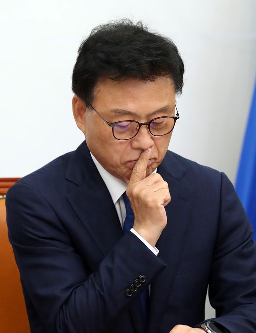 더불어민주당 박광온 원내대표가 31일 국회에서 열린 당 최고위원회의에서 생각에 잠겨 있다. 그는 이날 입장문을 통해 “후쿠시마 원전 오염수 시찰단의 기자회견은 국민 기만”이라며 청문회·국제해양법재판소 제소 추진의 뜻을 밝혔다. 뉴시스 |