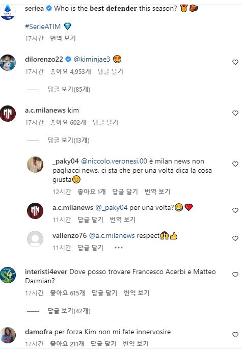 실제로 후보가 발표된 세리에 A 공식 SNS에서도 김민재가 높은 지지를 받고 있다. 특히 주목해야 될 것은 경쟁자들이 보여준 태도.