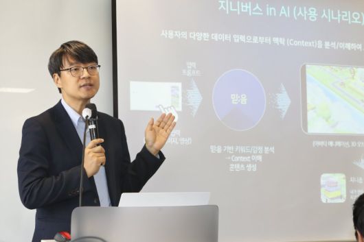 KT 융합기술원 AI2XL 원종서 팀장이 지난 5월 30일 서울 종로구 버텍스에서 지니버스 전략을 설명하고 있다. KT 제공 |