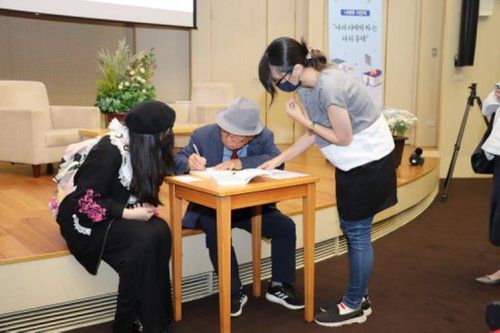 (타이베이=연합뉴스) 김철문 통신원 = 나태주 시인이 31일(현지시간) 한국문화예술위원회와 주타이베이 한국대표부 공동 개최로 타이베이 국립대만대학교에서 열린 '한국 문학의 날' 행사에서 독자에게 사인하고 있다. 2023.6.1