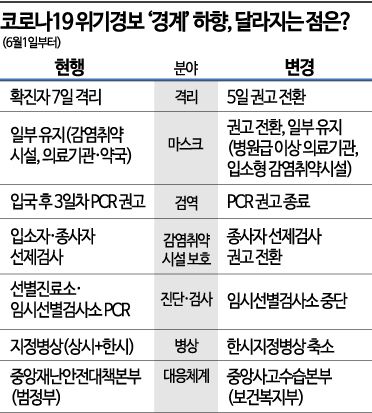이날부터 격리 기간이 남은 확진자를 포함해 코로나 격리 의무는 사라지고 격리 권고(5일)로 전환된다. 확진자도 이제 회사와 학교에 갈 수 있게 된 것이다. 방역당국은 '아프면 쉬는 문화' 정착을 위해 각 사업장과 학교 등 기관에 격리 권고 기간을 준수할 수 있도록 독려한다는 방침이다.