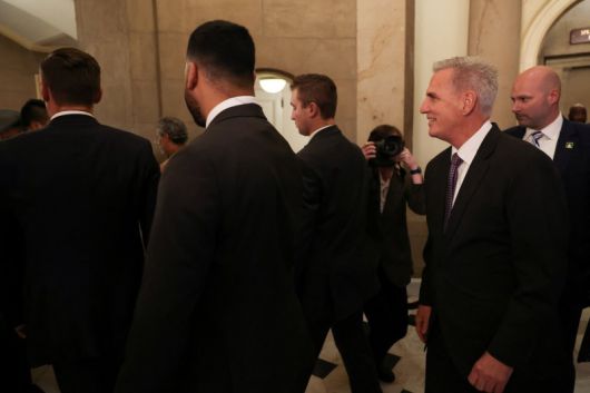 케빈 매카시(오른쪽 두번째) 미국 하원 의장이 5월 31일(현지시간) 채무한도 유예 합의안 표결을 앞두고 워싱턴 의사당의 의장실에서 하원 회의장으로 이동하고 있다. 뉴욕증시는 이날 공화당 강경파의 거센 반발 속에 하원 표결을 앞두고 하락 마감했다. 로이터뉴스1 |