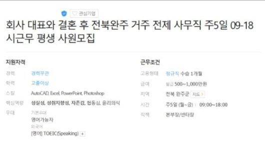지난달 30일 취업정보 전문업체 잡코리아에는 ‘회사 대표와 결혼 후 전북 완주 거주 전제 사무직 주 5일 09~18시 근무 평생 사원 모집’이라는 구인 공고가 올라왔다.