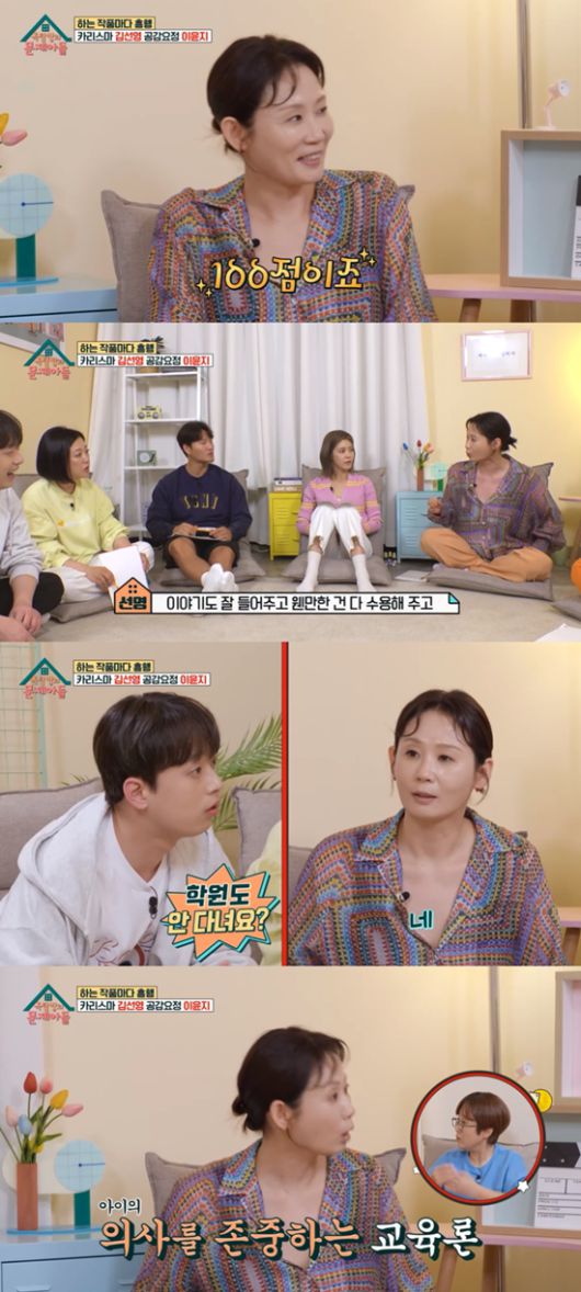 "엄마로서 몇 점이냐"는 질문에 김선영은 "100점"이라고 자신감을 드러냈다. 그는 "난 훌륭한 엄마다. 이야기도 잘 들어주고 웬만한 거 다 수용해 준다'며 "딸이 친구와 4시간을 놀았으면 그날은 공부 안 해도 된다고 한다. 이건 (딸) 친구들도 부러워하더라. 놀았는데 얼마나 피곤하냐. 공부보다 많이 놀아야 한다고 생각한다"고 전했다.