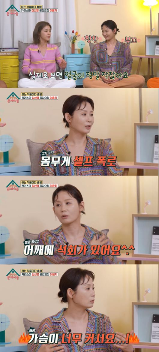 이에 김선영은 "어깨가 넓어서 얼굴이 작아 보이는 것"이라고 겸손함을 보였다. 그러면서 "몸무게 60kg 넘는다"고 셀프 폭로를 이어갔다.