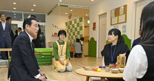 기시다 후미오 일본 총리가 1일 일본 정부의 저출산 대책인 '어린이 미래전략방침' 초안 발표을 앞두고 치바현 마츠도시의 한 어린이집을 방문했다. /사진=트위터 |