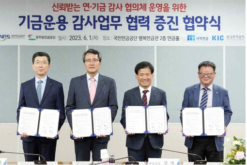 한국투자공사는 1일 오후 공무원연금 공단(상임감사 문성유), 국민연금공단(상임감사 김영), 사립학교 교직원연금공단(상임감사 류춘열)과 ‘기금운용 감사업무 교류 및 협력 증진’ 업무협약을 체결했다고 밝혔다.