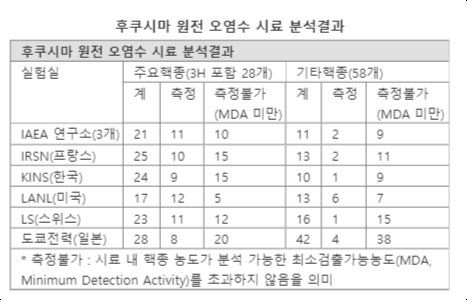 IAEA는 21개, 한국 24개, 미국 17개, 프랑스 25개, 스위스 23개, 도쿄전력 28개의 분석결과를 각각 제출했다. 김 실장은 "실험실마다 측정한 수치와 핵종 수가 조금씩 차이가 있는 것은 국가별 분석 방법이 다르며, 각 국가들마다 평상시 관심있는 대상에 따라 측정할 수 있는 핵종도 차이가 있다"고 설명했다.